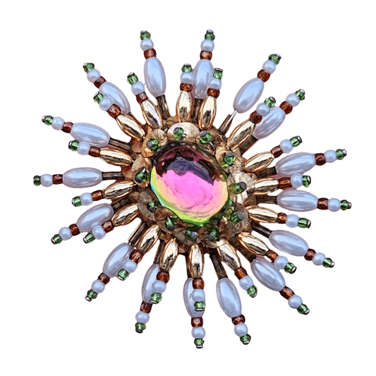 Antique Handmade Cork Brooch Pearl Red Green Gold Starburst Sequin