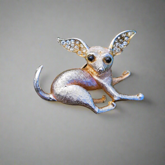 Vintage Chihuahua Brooch Crystal Gold Silver Tone Cute Dog Gift