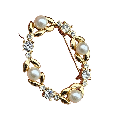 Pretty Oval Pearl Brooch Gold Diamante 90s Stylish Jewellery Pin Crystal