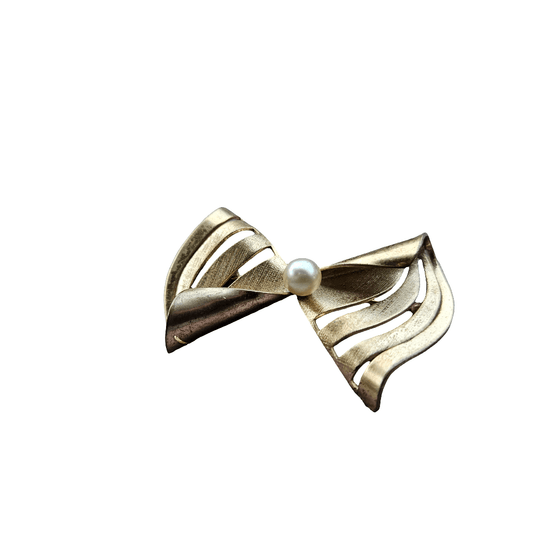 Gold Bow Pearl Brooch Pin Vintage Designer Fashion Jewellery