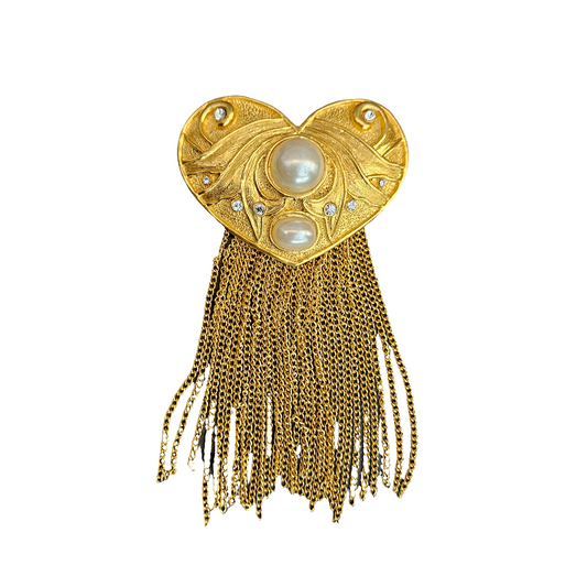 Large Heart Brooch Pearl Crystal Jewellery Tassels 80s 90s Designer Jewelry