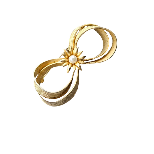 Matte Gold Bow Brooch Pearl Starburst Jewellery Jewelry Vintage