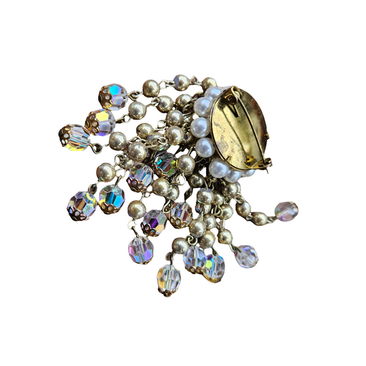 Vintage Cascade Brooch Rhinestone Pearl Waterfall Pin Golden Aurora Borealis