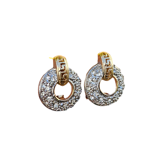 Vintage Earrings Crystal Greek Key Gold Pierced Studs Stylish High End