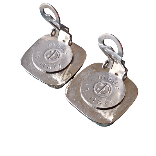 Italian Designer Earrings 70s 80s Mahogany Wood Clip On Chrome Silver