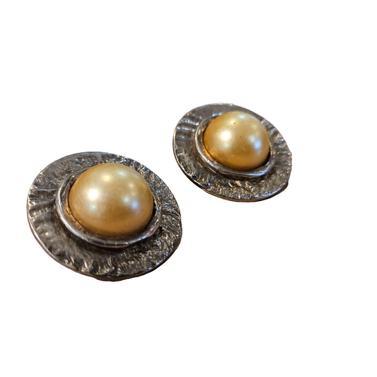 Large Silver Clip On Earrings Gold Pearl Cabochon Vintage Jewellery Jewelry 70s 80s