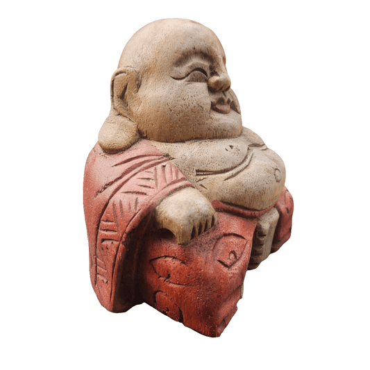 Carved Wooden Laughing Buddha Vintage Boho Decor Figurine Lucky Ornament Red