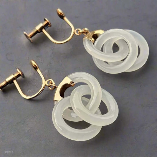 Chinese White Jade Three Ring Earrings 585 14k Gold Antique Screw On Nephrite