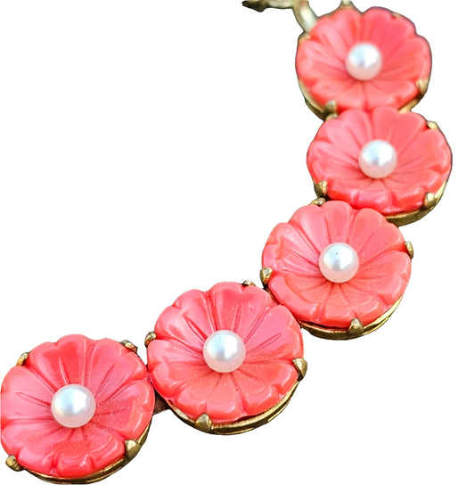 Carved Coral And Pearl Vintage Bracelet Gold Gilt Flower Jewellery
