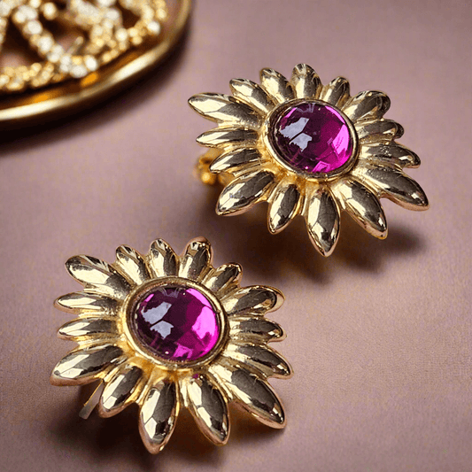 Amazing Gold Tone Pink Glass Cabochon Earrings 80s Clip On Star Flower