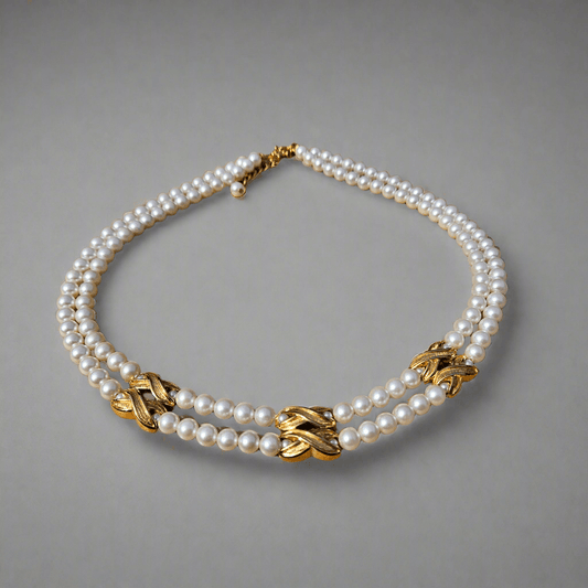 Vintage X Link Double Strand Gold Tone Pearl Necklace Designer Choker Jewellery