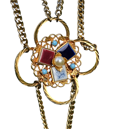 Long Gold Plated Necklace Ceramic Tile Vintage 80s Designer Jewellery Jewelry