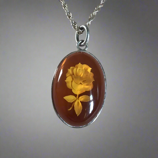 Sterling Silver Amber Rose Necklace Reverse Carved Pendant