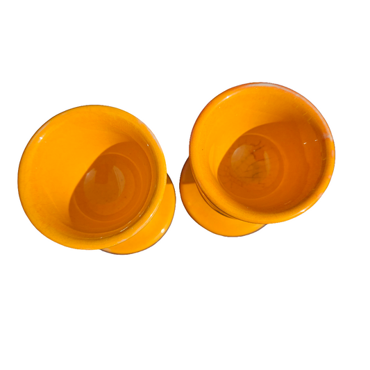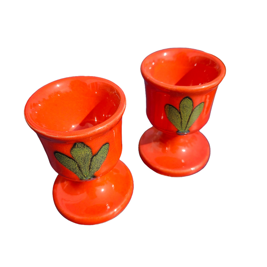 Pair 2 Orange Egg Cups Vintage Kitsch Studio Pottery Breakfast Set Green Glaze
