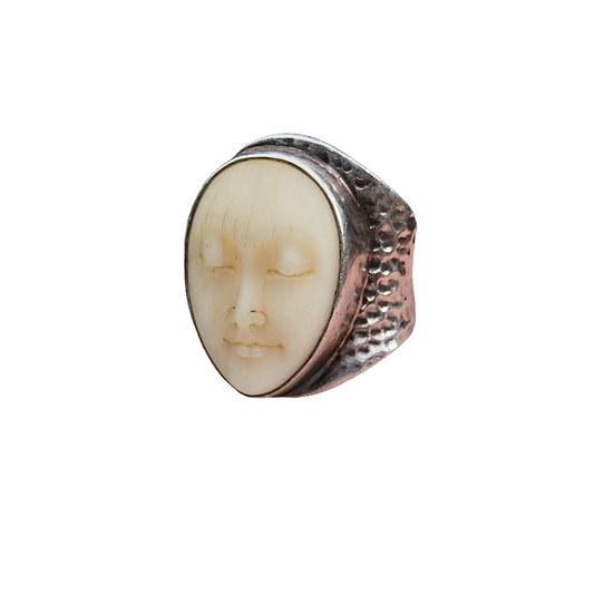 925 Silver Carved Bone Ring Lady Face Vintage Large Jewellery