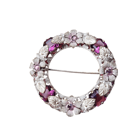 Silver Openwork Wreath Brooch Vintage Flower Pin Purple Lilac Rhinestone
