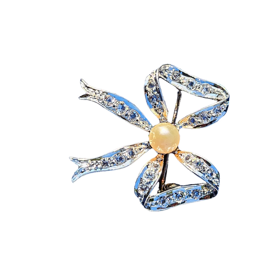 Sterling Silver Bow Brooch Diamante Pearl Pin Vintage Jewellery Jewelry
