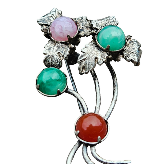 Antique Sterling Silver Brooch Pin Jewellery Glass Cabochon Flowers Bouquet Czech